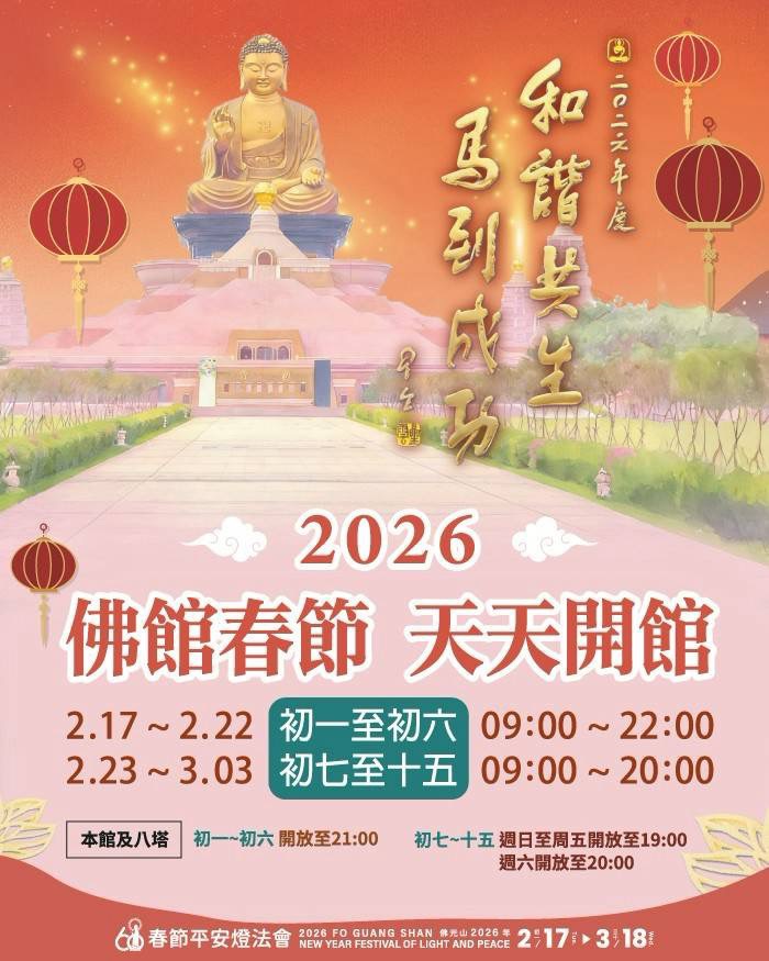 【記者張永漢/高雄報導】2026年春節,佛光山邀您一起感受滿滿的年味與祝福!「2026年春節平安燈法會」自2月17日(農曆正月初一)起至3月18日(正月三十)整整一個月舉行,活動期間除了平安燈、精彩表演與互動遊戲,還有豐富美食,晝夜皆適合全家同遊。