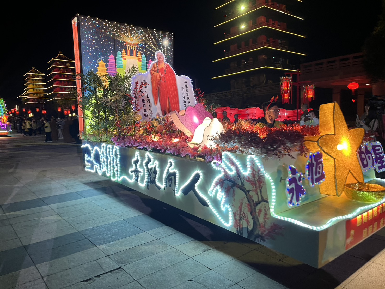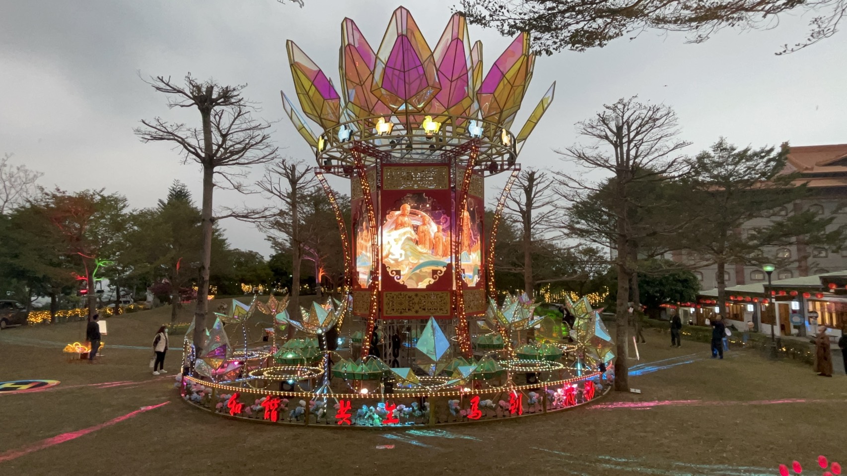法會今年的祝福語為「和諧共生‧馬到成功」,呼應馬年的吉祥寓意,也提醒大家以善意共創美好生活。春節主燈設於曼陀羅園,名為「蓮華飛騎」,高達12米,象徵「好事蓮蓮、馬到成功」,主燈蓮花底座周圍環繞六面LED螢幕,並設計互動遊戲如接福袋、迎好運,亮燈時間為初一至初六,每晚7時及9時各一場,鎏金飛馬展演時間3分鐘,璀璨奪目。