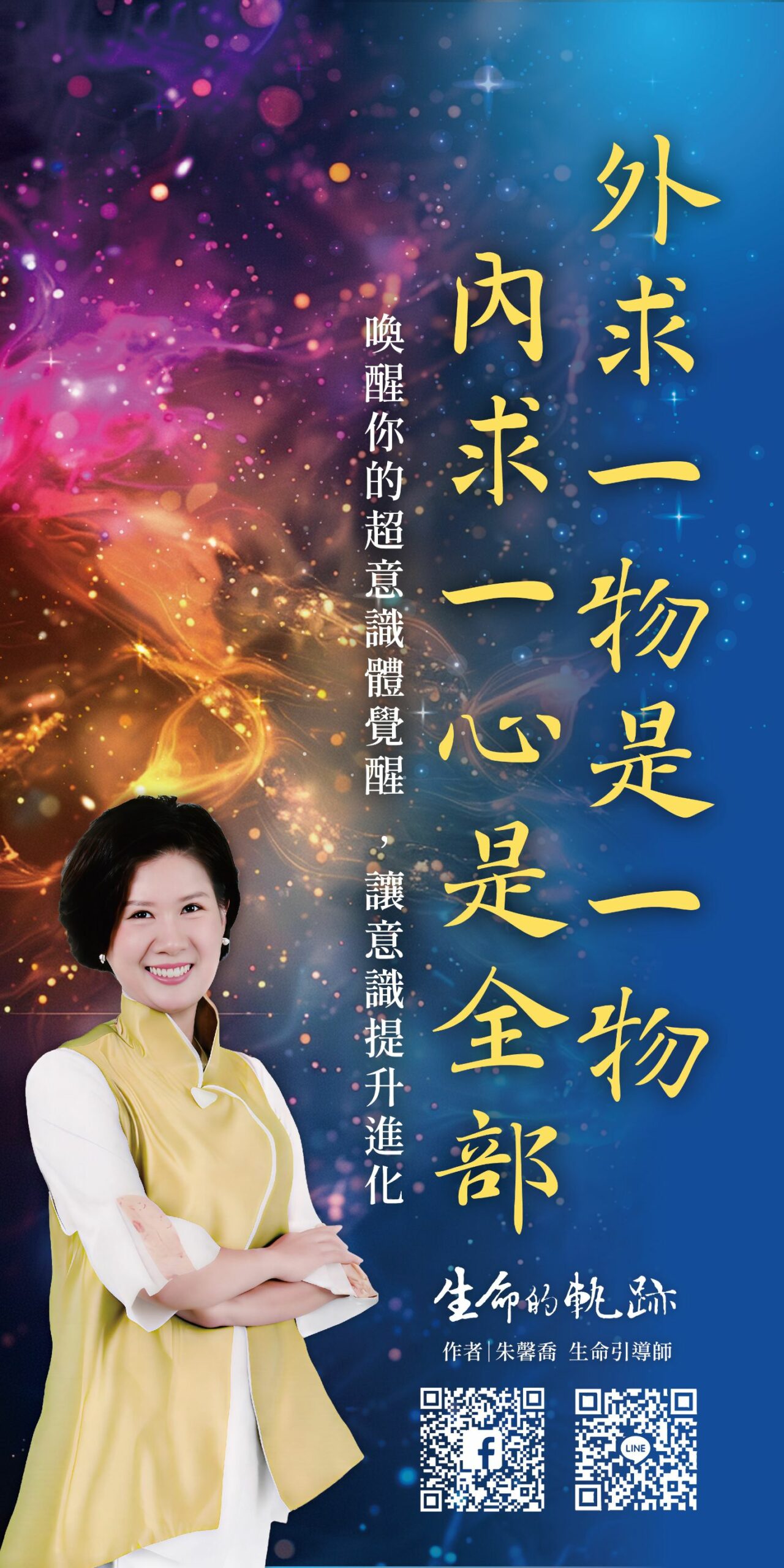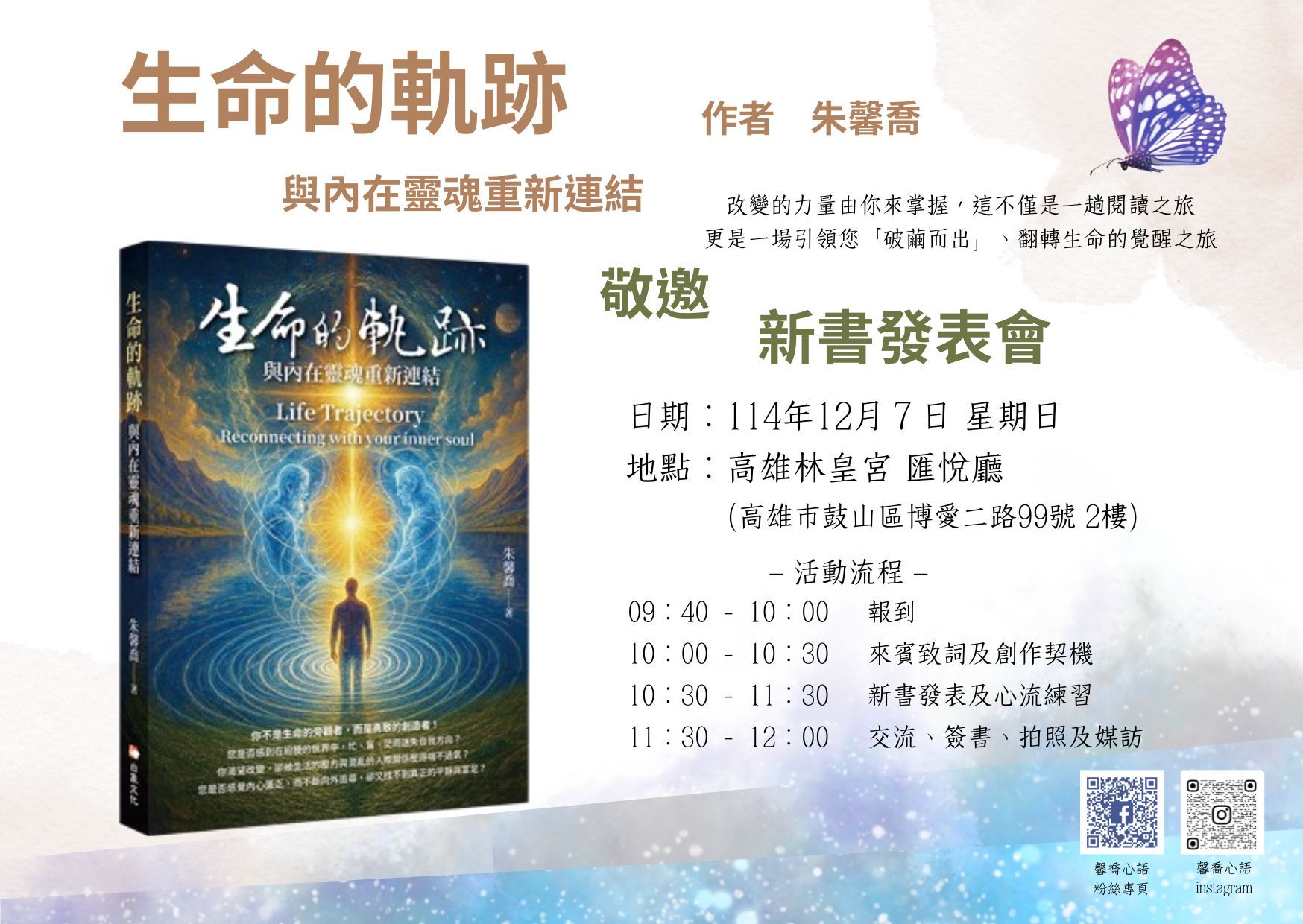 朱馨喬表示,真正的改變必須從自身啟動;《生命的軌跡》不僅是一趟閱讀之旅,更是一場引領讀者「破繭而出」的覺醒旅程。透過書中的引導練習,讀者能迅速沉浸於心靈能量的流動中,使生命意識自然提升,進而轉化能量、安頓情緒,從內而外帶來平靜與清明。