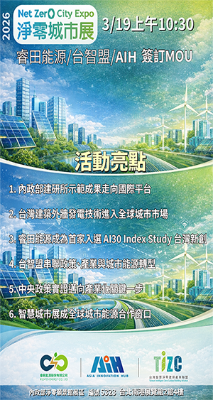 睿田能源股份有限公司 今日宣布,將於3月19日上午10時30分 在「2026智慧城市展暨淨零城市展」期間,與 Asia Innovation Hub(AIH)及 台灣智慧淨零建築產業聯盟 簽署三方合作意向書(MOU),共同推動淨零建築、立面光電與城市能源治理的應用發展。