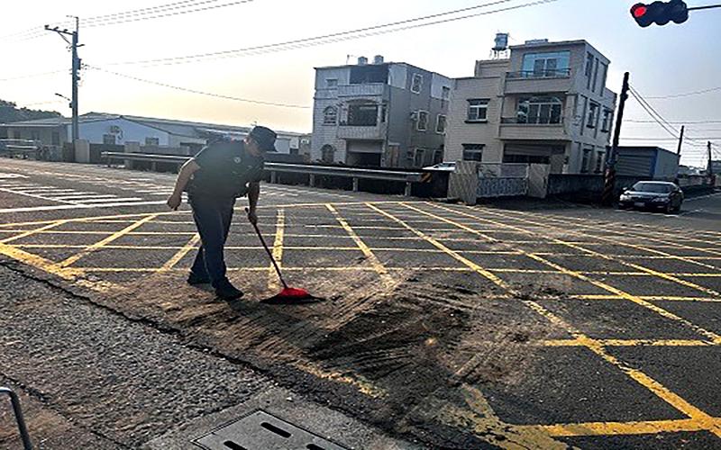 無獨有偶,湖街派出所員警孫郁勛、鄭伃婷同月7日擔服6至8時巡邏勤務時,接獲報案於湖內區忠孝街54巷口有大片泥土影響通行,員警趕赴現場查看並通知清潔隊前往處理,因清潔隊未到上班時間無法立即清除,員警便先行向附近住戶借掃帚,將大型泥塊掃除乾淨,還給民眾整潔、通行安全的道路環境。