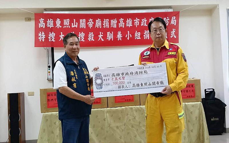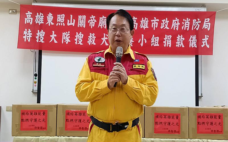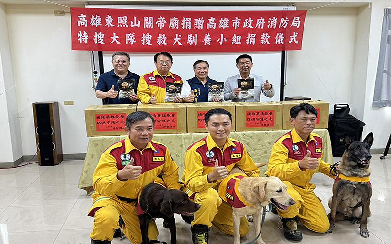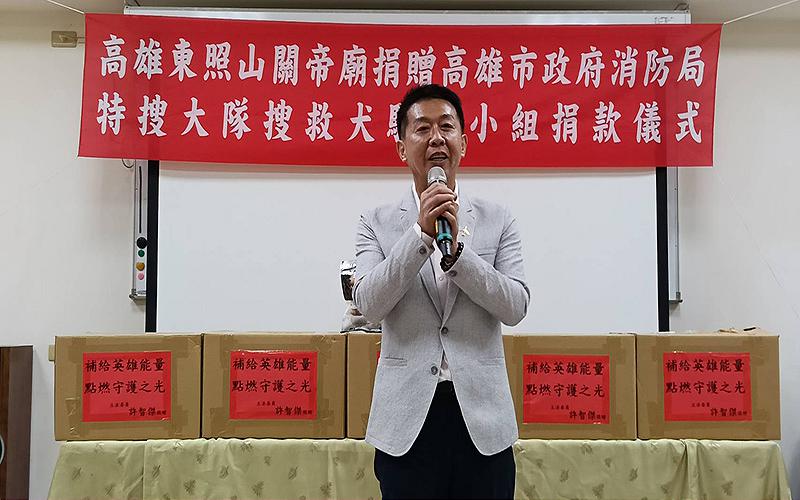 【記者朱國維/高雄報導】民進黨高雄市長初選參選人立法委員許智傑,發起捐贈經費及搜救犬專用狗糧資助高市消防局搜救大隊,獲得高雄東照山關帝廟、頂麻吉竉物公司熱絡響應;許智傑強調,感恩東照山十萬元的捐助,共同慰勉該搜救大隊在這二年來前往花蓮救災,成功挽回一百八十一人生命的豐碩成果。