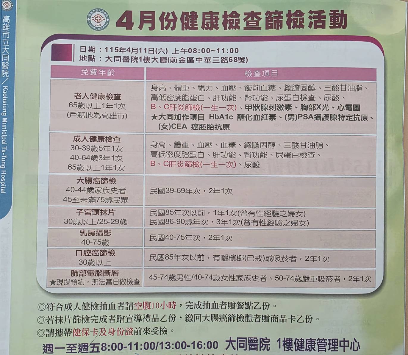 本次活動於上午8時至11時,在大同醫院健康管理中心辦理,提供多項免費檢查服務,包括胸部X光、心電圖、甲狀腺刺激素篩檢等老人健檢套組;另加碼提供HbA1c醣化血紅素檢測,男性可接受PSA攝護腺特定抗原檢查,女性則提供CEA癌胚胎抗原檢測,內容相當完整。