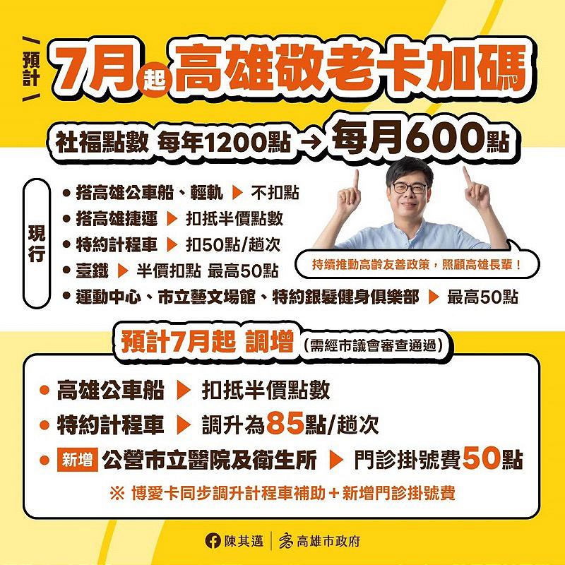 為鼓勵更多長輩走出家門,預計115年7月起、經議會審議通過相關預算後,✨社福點數將從每年1,200點調升為每月600點✨追加預算約1.6億餘元。